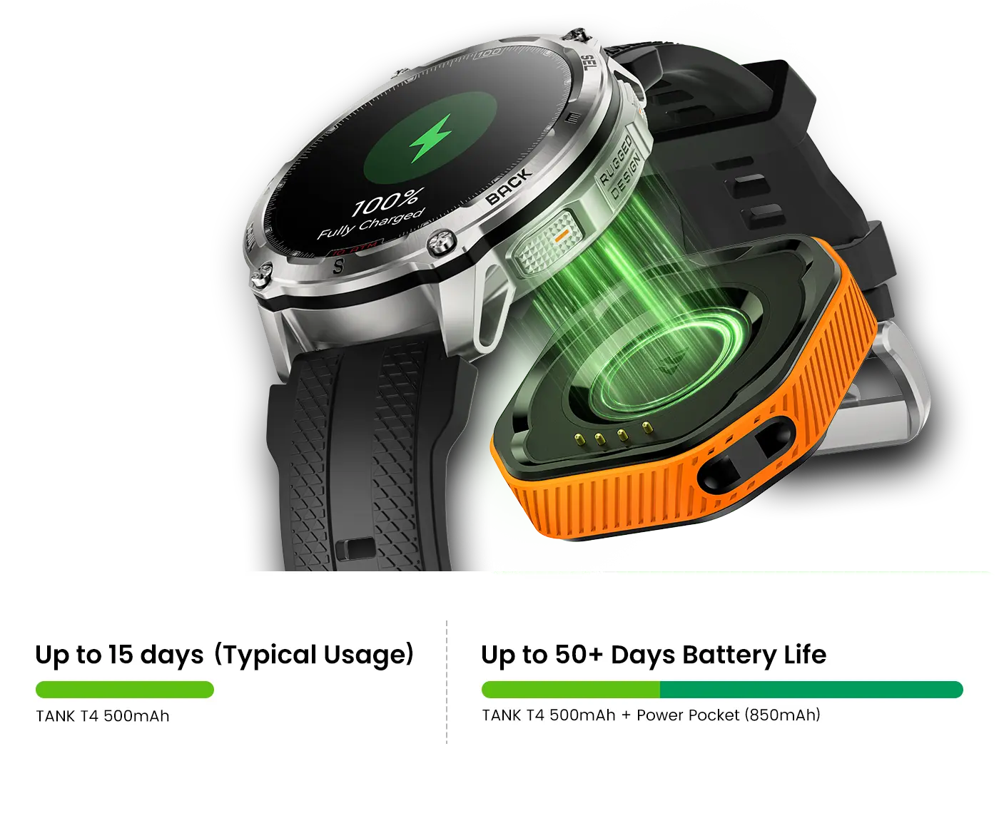 The TANK T4 lasts up to 15 days (Typical Usage) on a single charge.