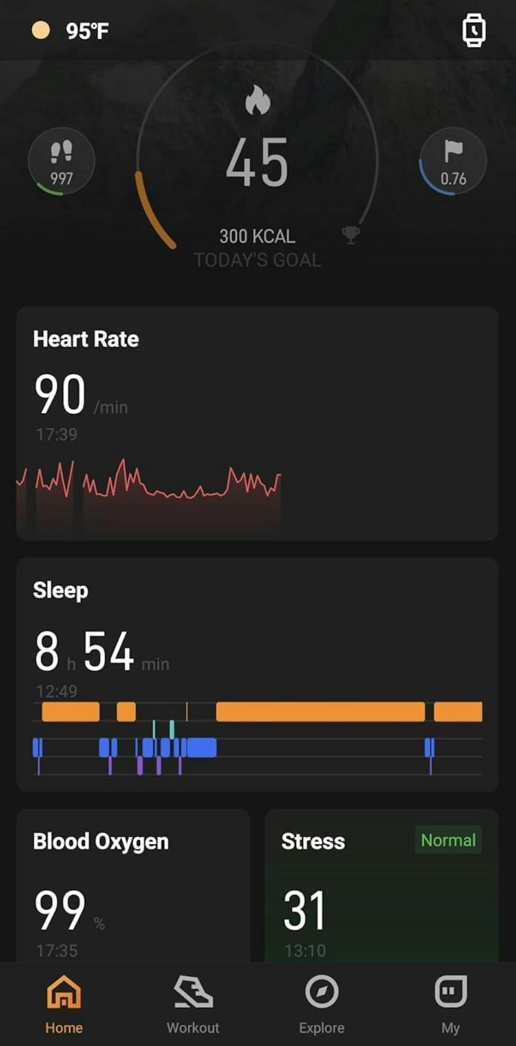 The health features are solid. Continuous heart rate, SpO₂, stress, and even mood tracking keep me more aware of my well-being. It also auto-detects popular exercises like walking, running, cycling, and elliptical workouts, which makes it easy to log activity without fiddling with settings.